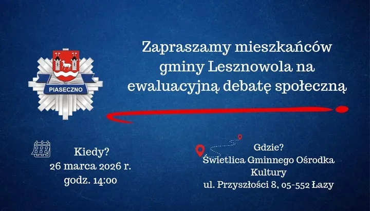 W świetlicy Gminnego Ośrodka Kultury w Łazach 26 marca o godzinie 14:00 odbędzie się debata społeczna ewaluacyjna. Policjanci i mieszkańcy gminy Lesznowola wrócą do postulatów oraz wniosków zgłoszonych podczas spotkania z ubiegłego roku.
