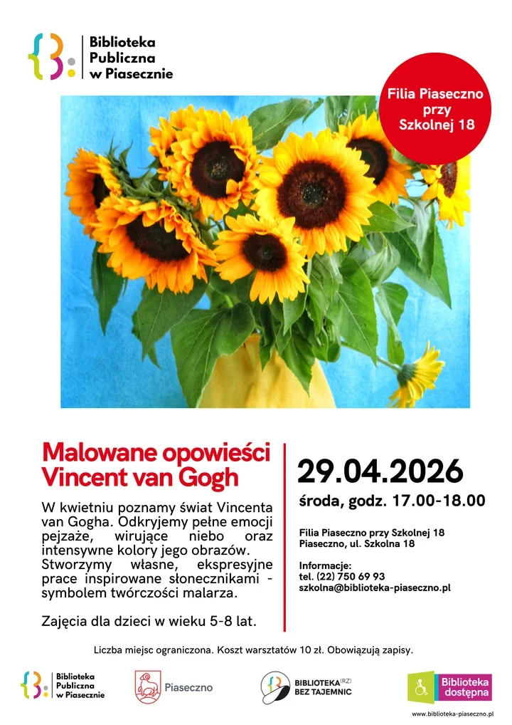 W filii w Piasecznie przy Szkolnej 18 wiosna będzie miała mocny, malarski akcent. Na warsztatach „Malowane opowieści” najmłodsi wejdą w świat Vincenta van Gogha, gdzie niebo wiruje, a żółte słoneczniki robią więcej zamieszania niż niejeden kinderbal 🎨🌻