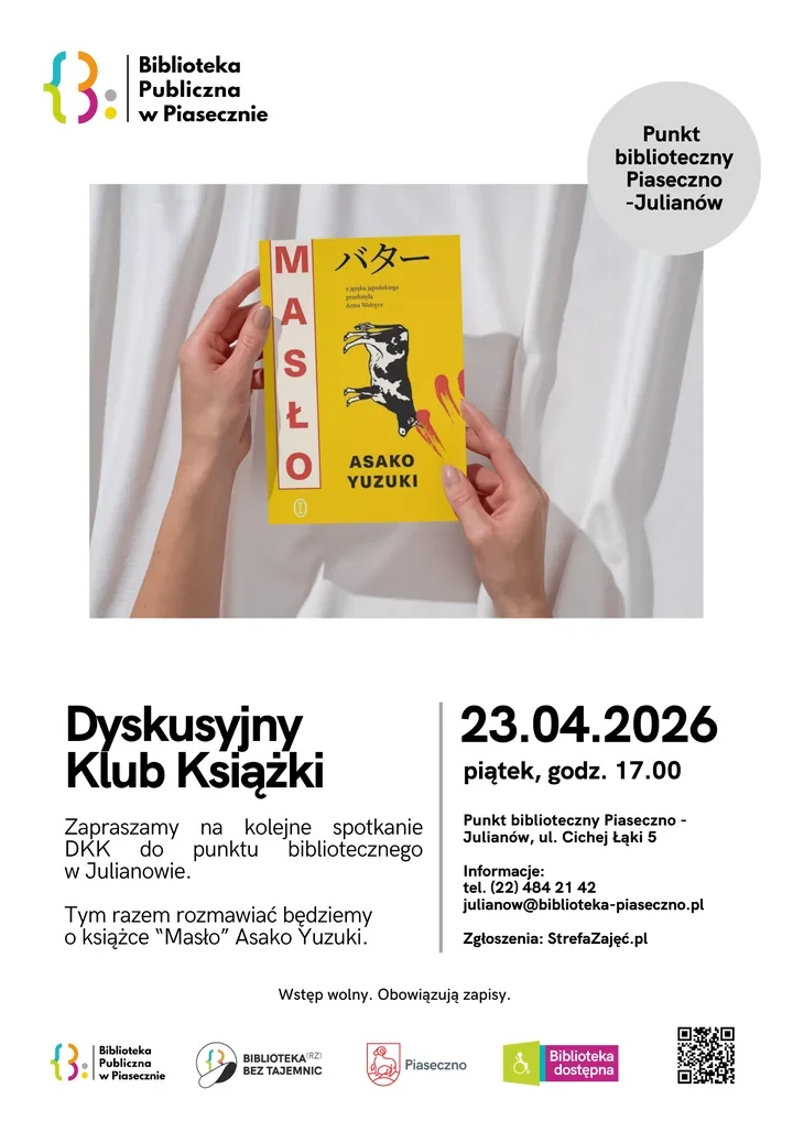 Spotkanie odbędzie się 23 kwietnia 2026 roku (czwartek) o godzinie 17.00 w Punkcie bibliotecznym w Julianowie. Wstęp jest bezpłatny, ale liczba miejsc jest ograniczona.