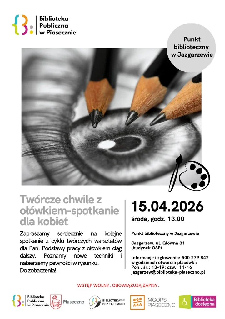 Wszystko odbędzie się 15.04.2026 r. o 13.00 w Punkcie Bibliotecznym w Jazgarzewie, ul. Główna 31 (budynek OSP). Zajęcia potrwają 2 godziny. Zapisy przyjmowane są pod tel. 500 279 842 oraz mailowo: [email protected].