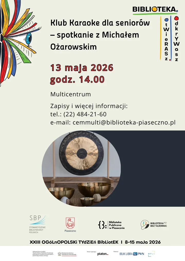 W Piasecznie Tydzień Bibliotek przybierze w tym roku spokojniejszy, ale bardzo ciekawy rytm. W Multicentrum spotka się Klub Karaoke dla Seniorów, a zajęcia poprowadzi Michał Ożarowski - tym razem zamiast scenicznej tremy będzie oddech, dźwięk i dużo łagodnego rozluźnienia. 🎤