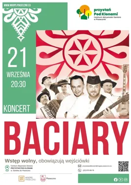 Zaplanowano wieczorny występ zespołu Baciary w ogrodzie przy Centrum Aktywności Seniora w Piasecznie. To jednodniowe wydarzenie muzyczne z gatunku muzyki góralskiej i rozrywkowej, podczas którego zespół zaprezentuje swoje znane utwory. Wstęp na koncert jest bezpłatny, lecz wymagana jest wejściówka odebrana wcześniej w recepcji miejsca wydarzenia.